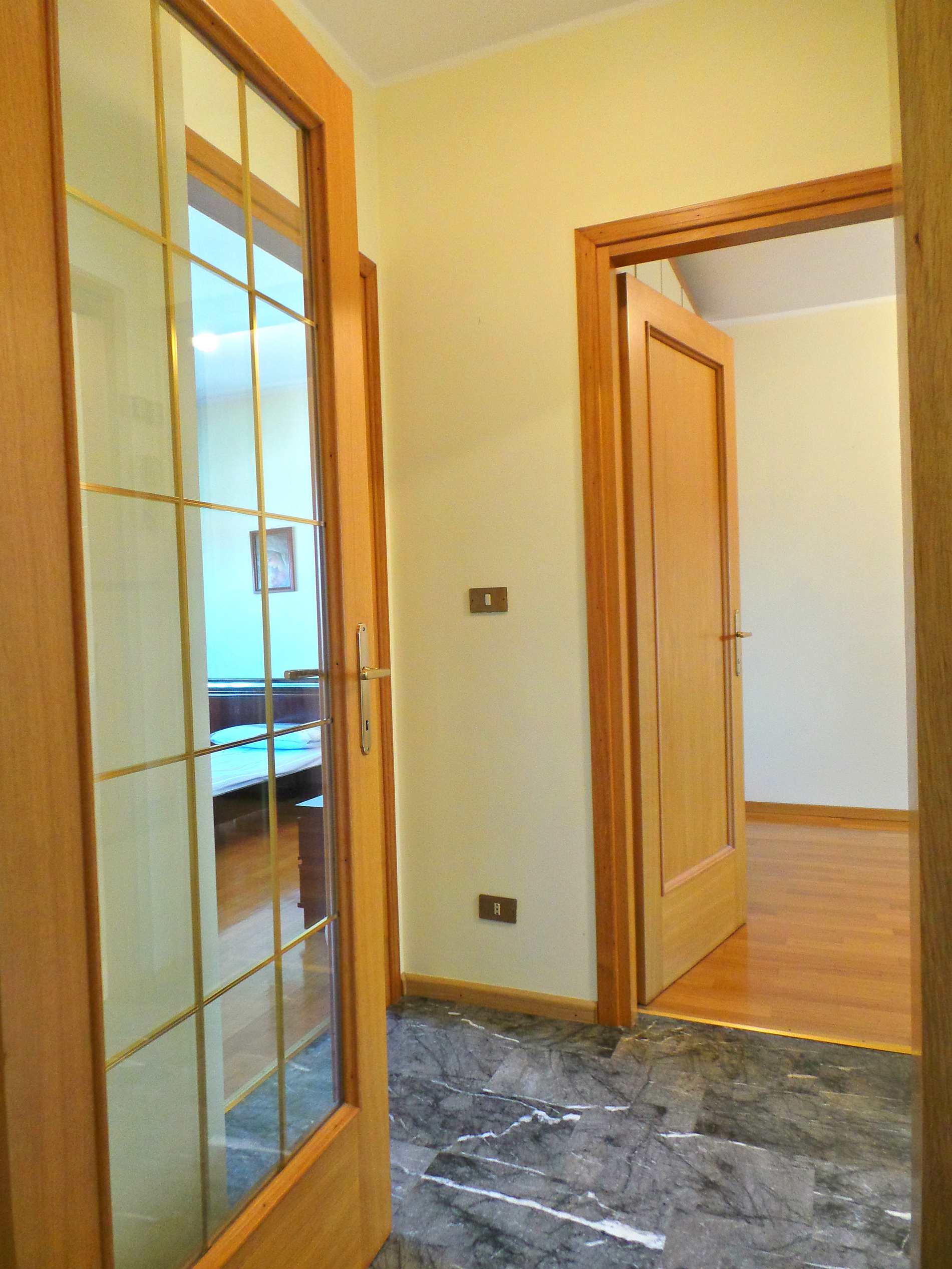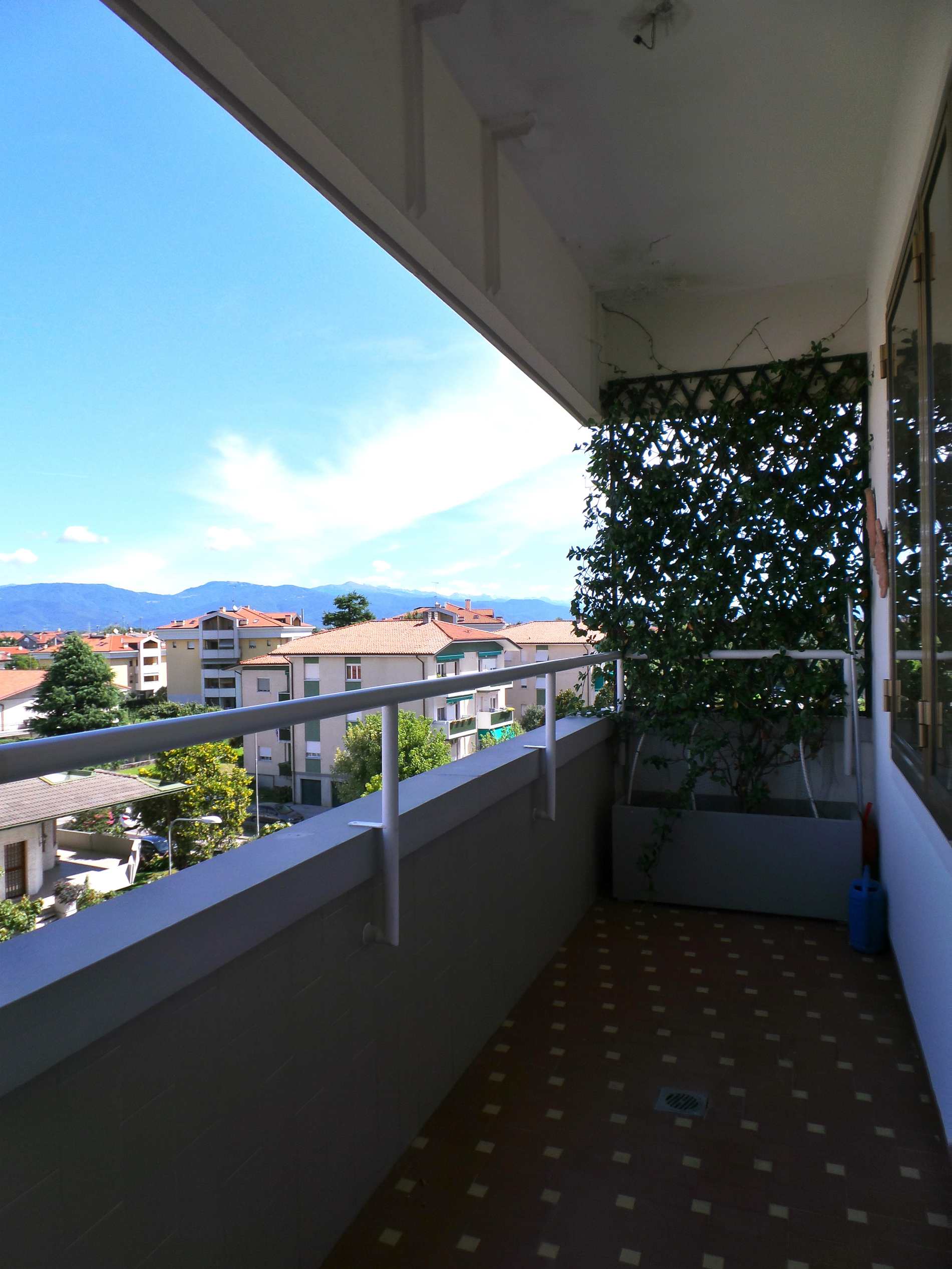 Bellissimo appartamento bicamere al quarto piano con ascensore in condominio fine anni ’70, perfettamente mantenuto e con splendida vista sulle montagne. La disposizione è classica con corridoio centrale: zona giorno luminosa con salotto e terrazzo panoramico, cucina separata e abitabile con veranda affacciata sul giardino interno. La zona notte offre una camera matrimoniale spaziosa, una grande camera singola e un bagno finestrato con box doccia. Riscaldamento centralizzato con contacalorie e condizionatore già installato. Le spese condominiali comprendono riscaldamento, acqua calda e fredda, amministratore, ascensore, manutenzioni e pulizie: Euro 180/mese. Completa la proprietà una comoda cantina al piano interrato.