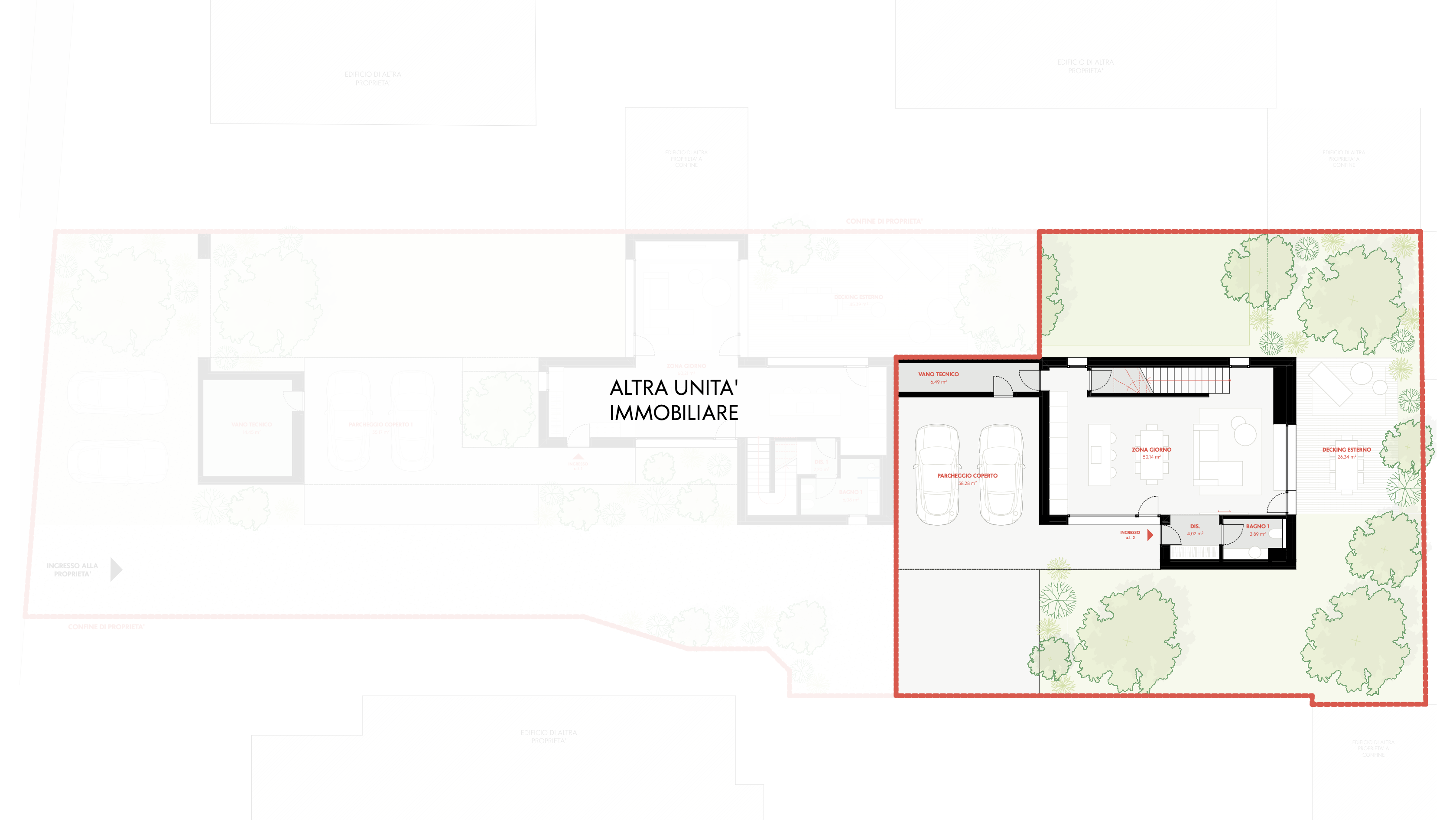 L’abitazione si sviluppa su due livelli: al piano terra una luminosissima zona giorno open space si apre idealmente verso l’esterno grazie a un ampio deck pavimentato, perfetto per estendere la vita della casa all’aperto e godere dell’intimità del giardino. Completano il piano un bagno ospiti e una pratica lavanderia.