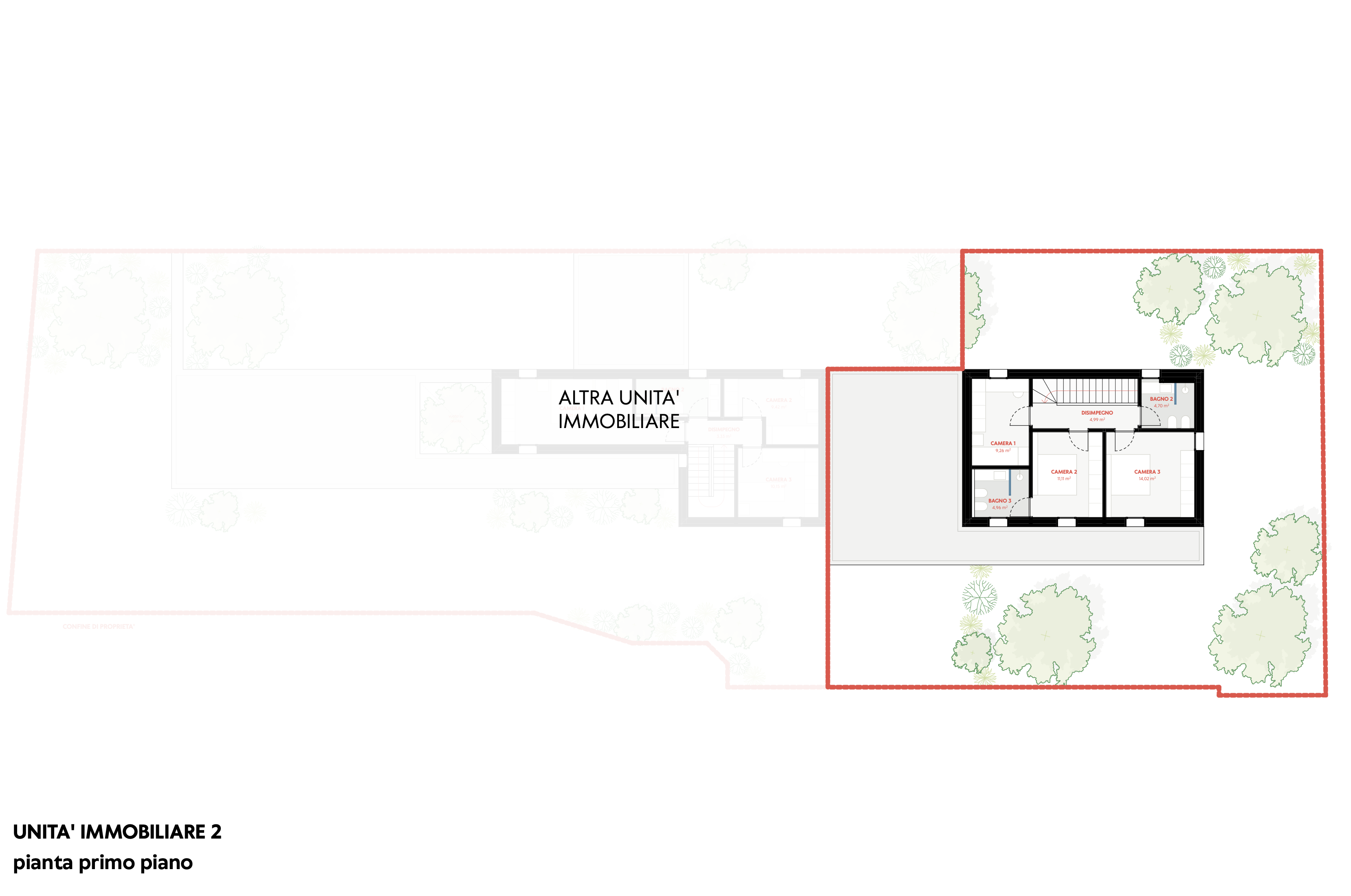 Il primo piano ospita tre camere da letto, tra cui una con il bagno interno, e un secondo bagno a servizio delle altre due camere.